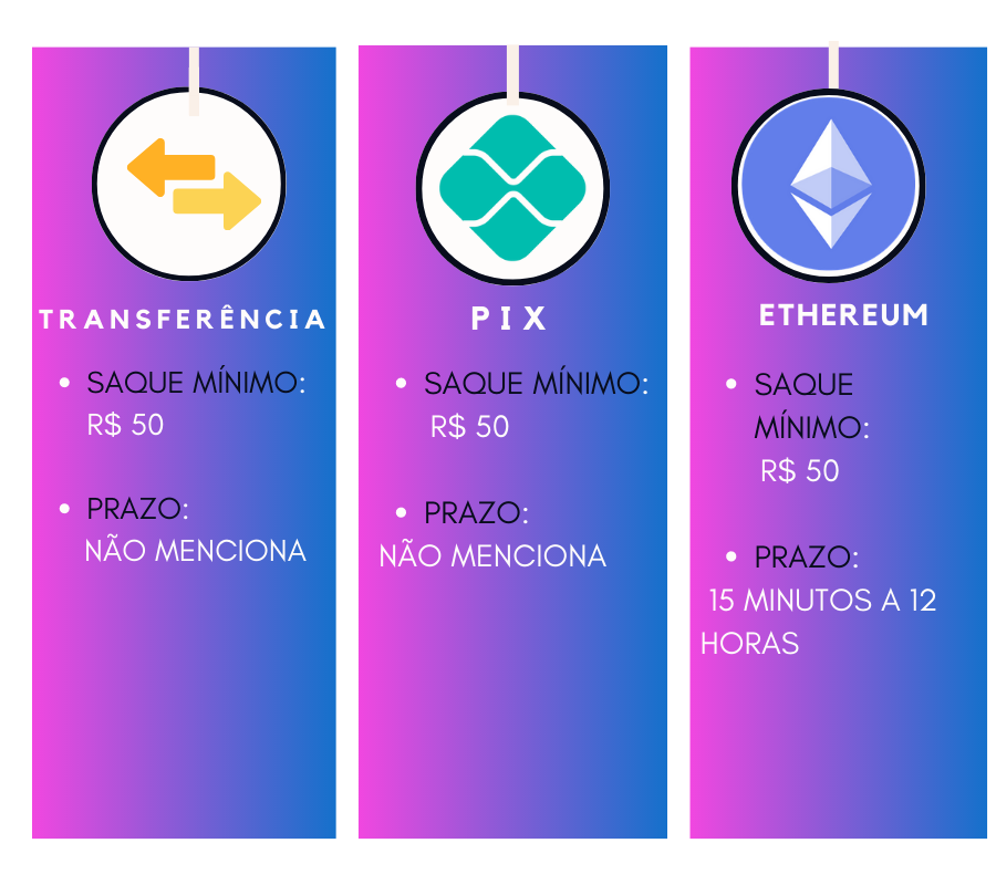 Atualmente, a plataforma disponibiliza três métodos de saque, conforme indicado ao lado.