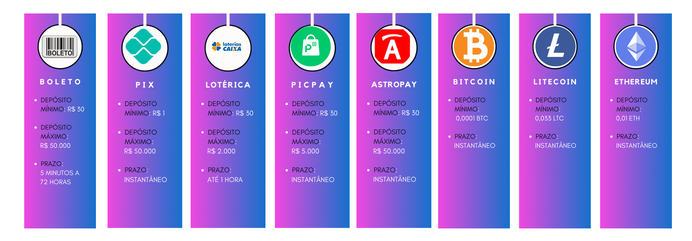 Com exceção do PicPay e da Astropay, não é possível realizar depósitos por meio de carteiras eletrônicas como Neteller e ecoPayz, que são bastante populares entre apostadores brasileiros.